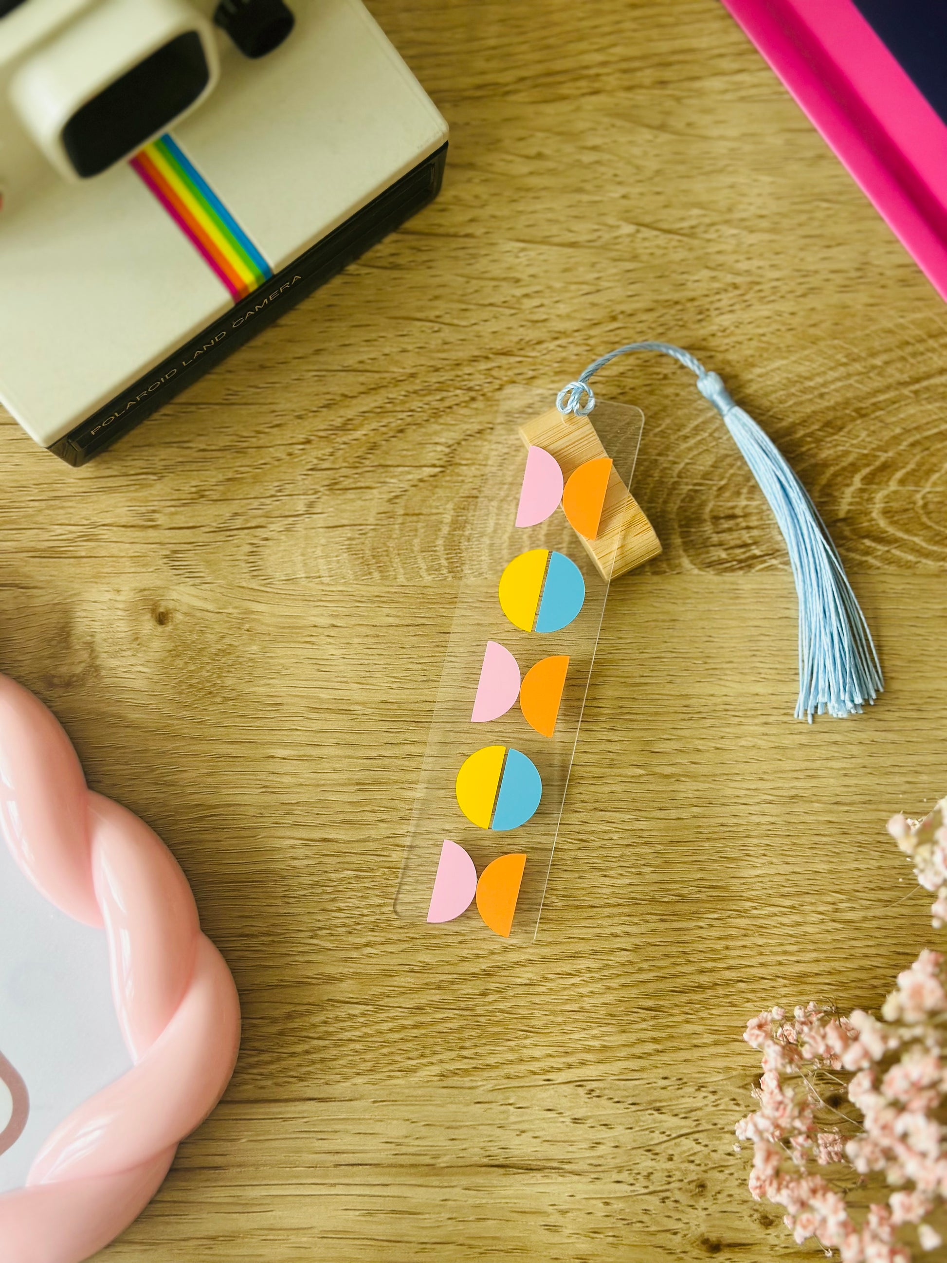Un petit bout de soleil vintage glissé dans ton bouquin. Ce marque-page transparent et tout léger ne fait pas que garder ta page : il te glisse un sourire à chaque chapitre. Motifs rétro, couleurs pétillantes, et un pompon ciel pour faire swinguer ta lecture. Un clin d’œil aux années 70 pour accompagner tes pauses lecture… et tes pensées qui partent en vrille.