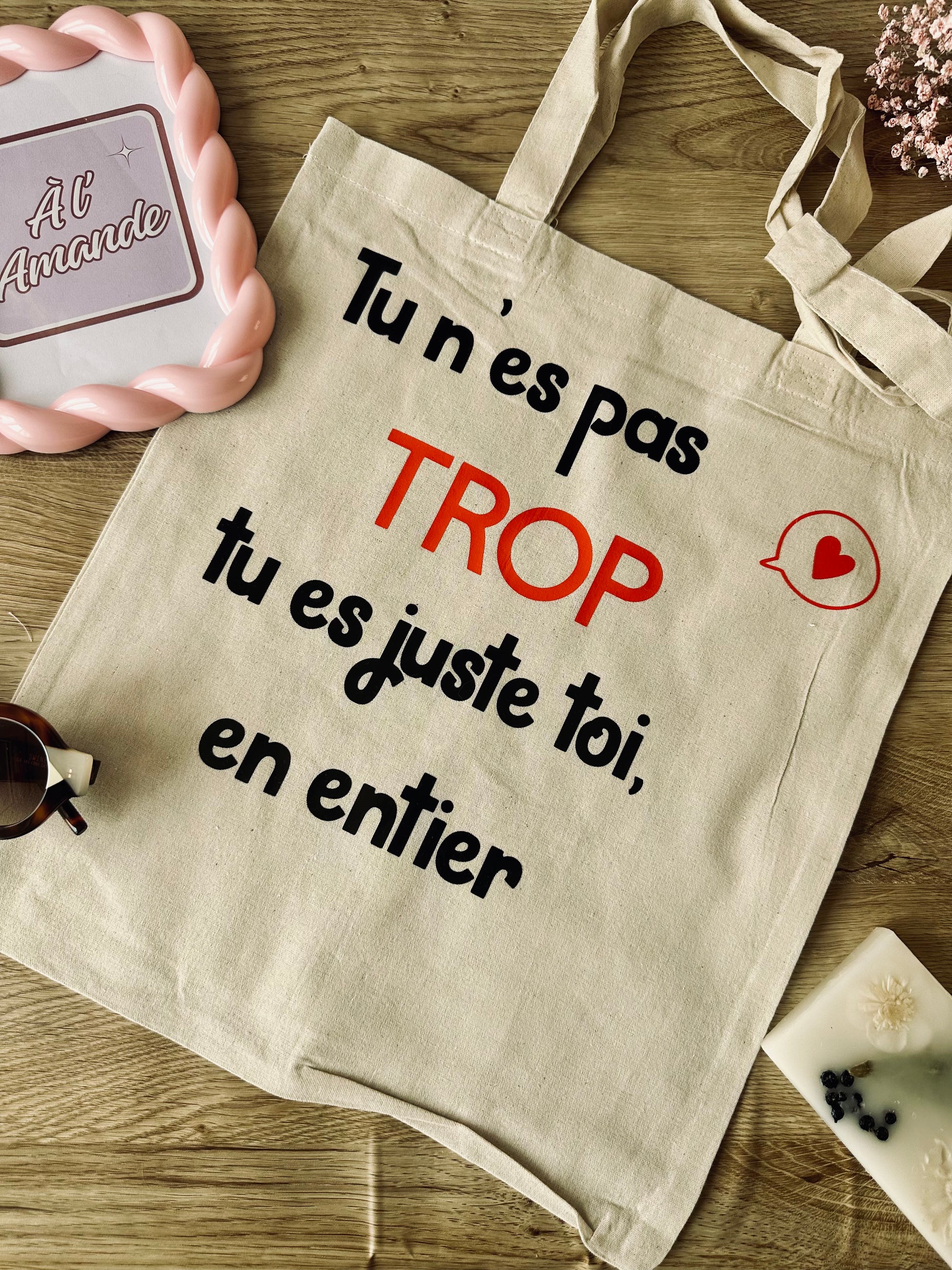 Ce tote bag, c’est un cri du cœur pour toutes celles et ceux qu’on a un jour traités de “trop”. Trop intense, trop sensible, trop bavard·e, trop tout.
