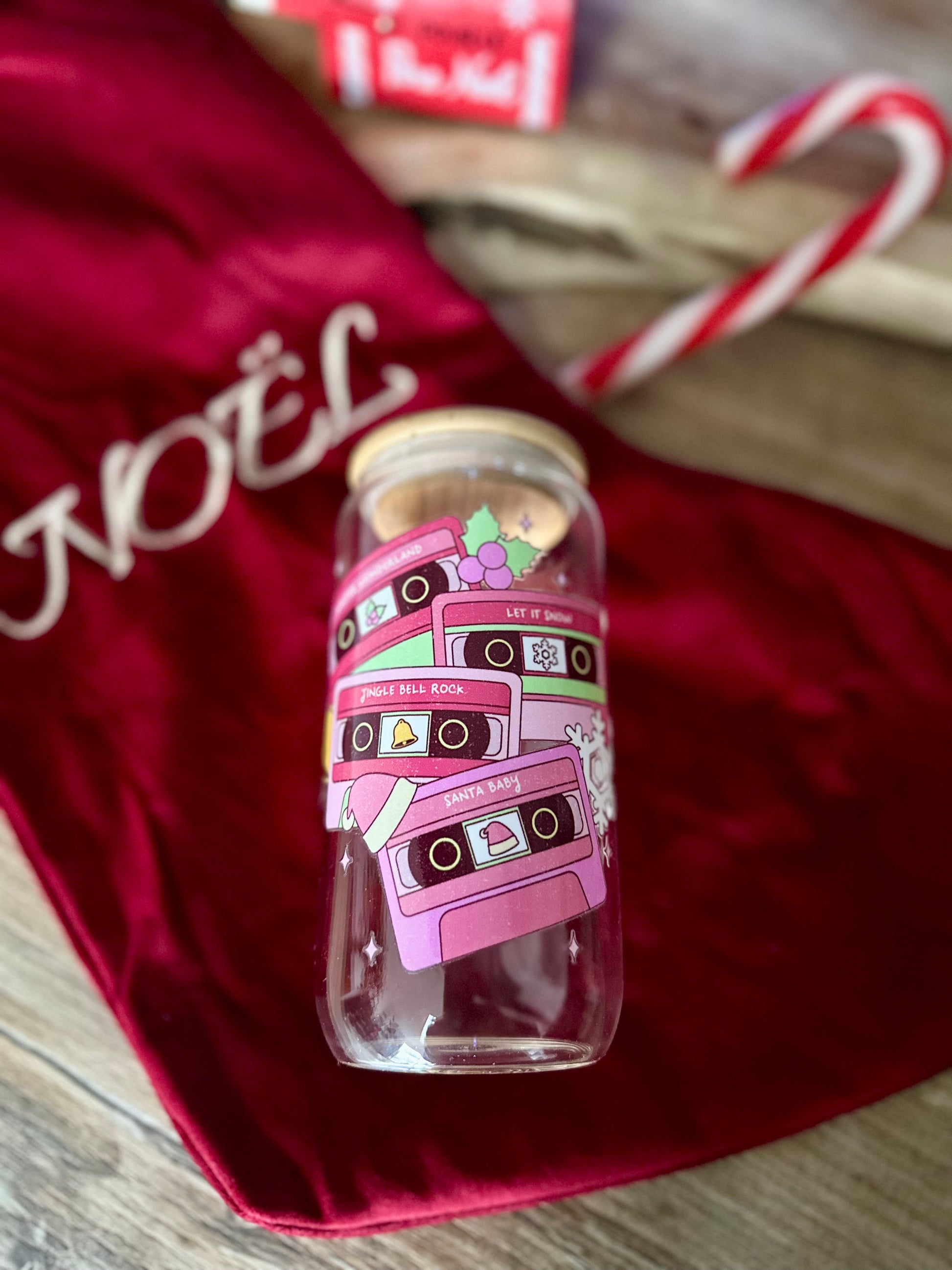 Avec ses cassettes roses façon années 90, ses petits détails scintillants, ses flocons et ses touches pastel, c’est le verre parfait pour celles et ceux qui vivent les fêtes en musique.