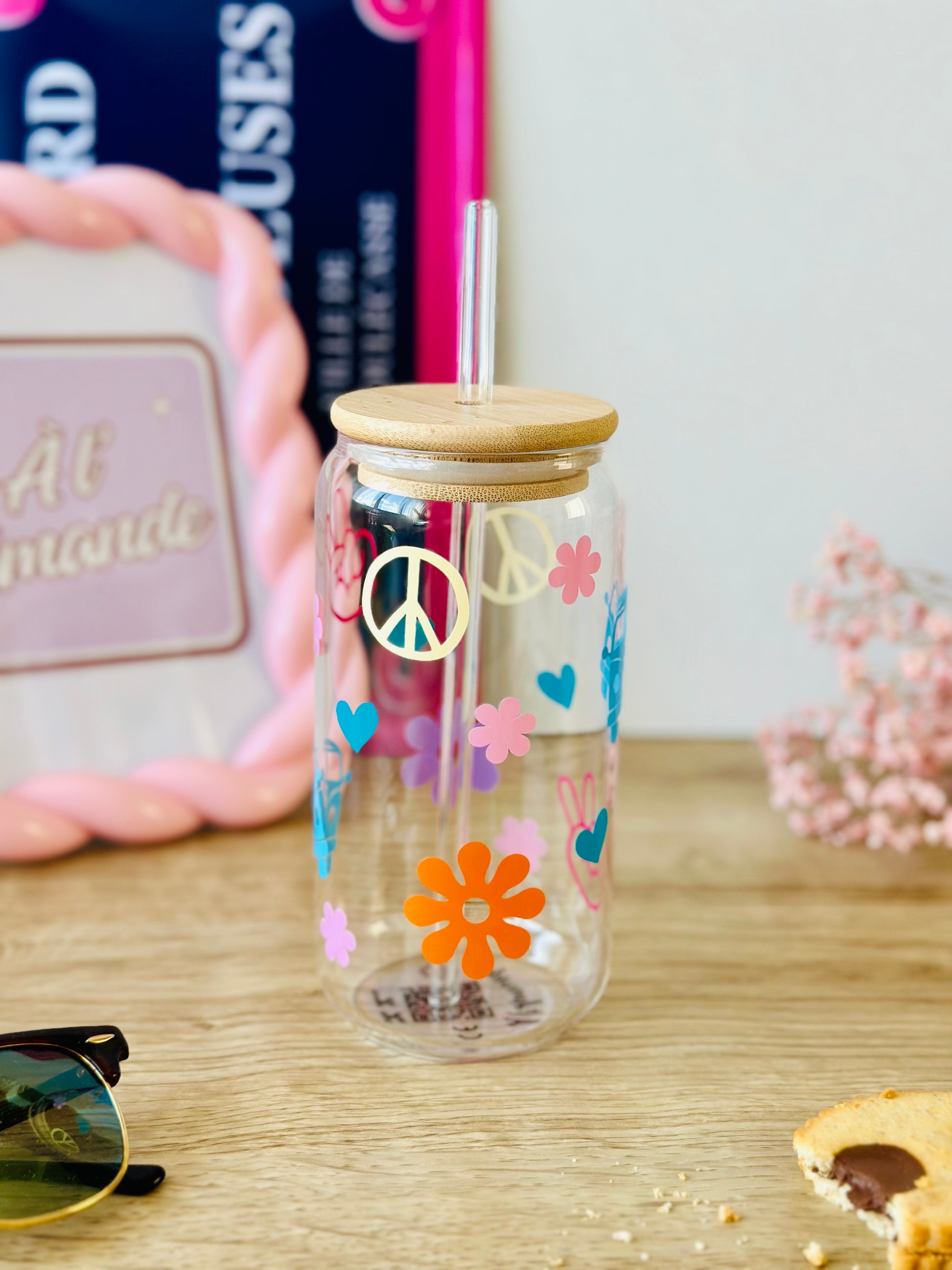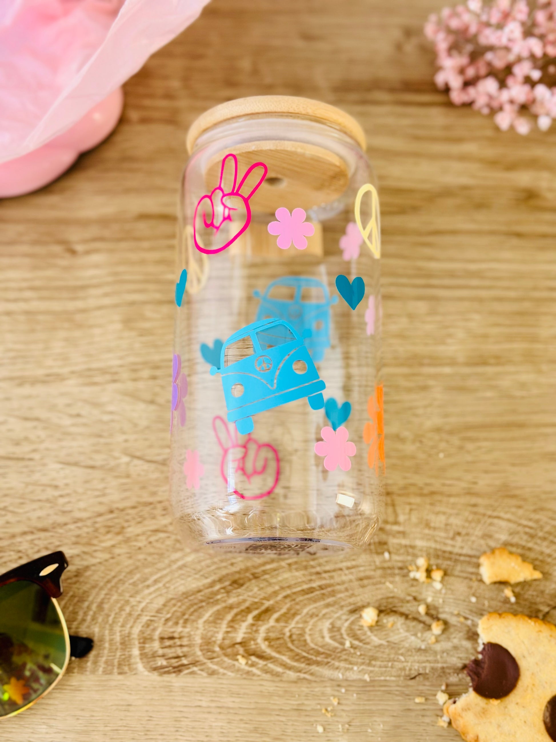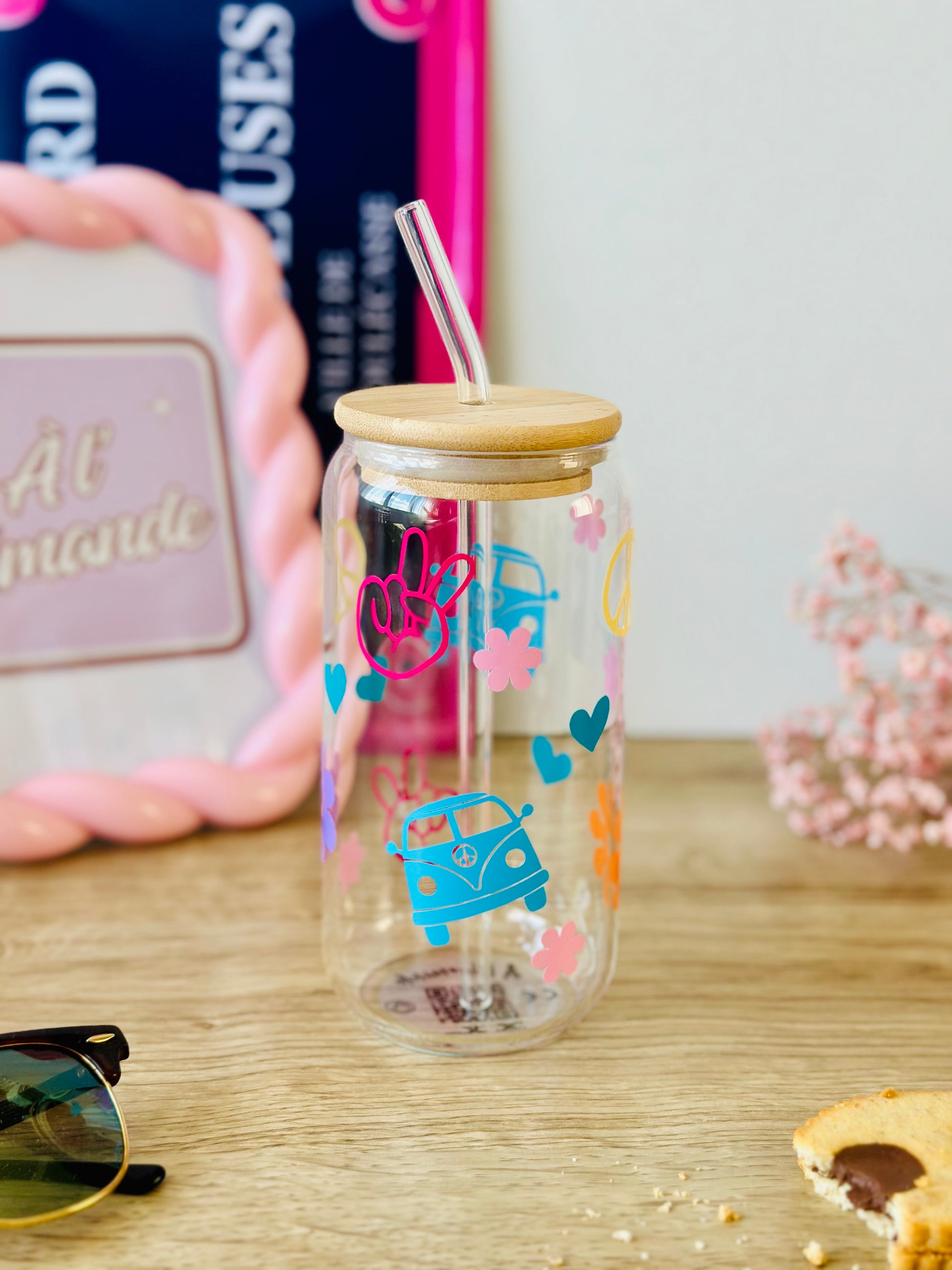 Fleurs vintage, van hippie, cœurs et vibes peace & love : ce verre c’est un aller simple pour les années 70, sans quitter ton plaid.